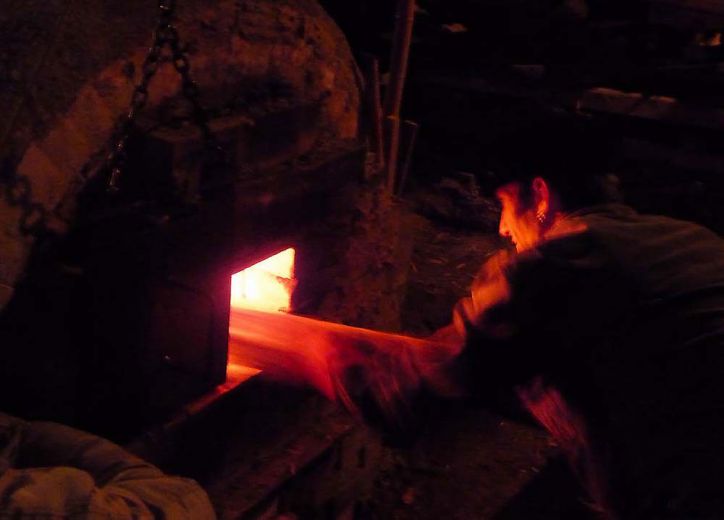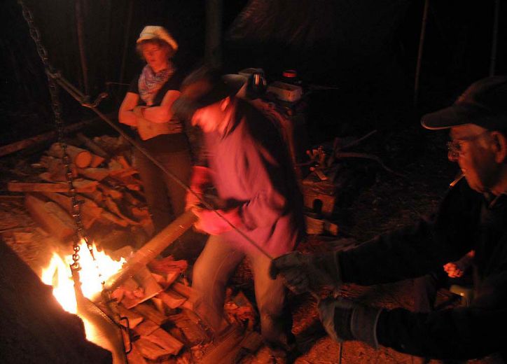 In an attempt to even out the kiln, side stoking is started about 9pm on Saturday, lightly at first, but soon a more vigorous rhythm is established that burns off embers at the front but builds them up over the pots at the side stoke ports. Playing with the active damper also creates more backpressure and flame. This helps bend over the cone 8 half way down the kiln and keep the night shift busy.
