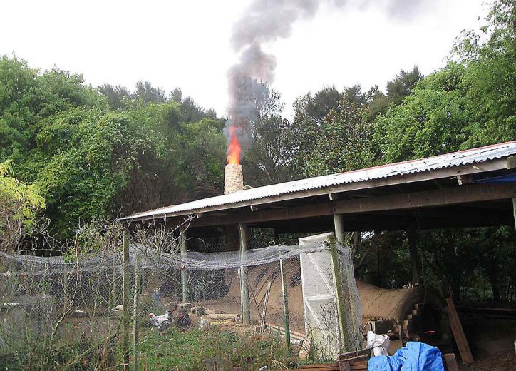 Sunday morning brings a more controlled approach, but the feeling is that the kiln is still drying out at the bottom and so a steady stoking rhythm is maintained that keeps shrinking the wood pile at a good rate. But that means that on Sunday we’re off to gather more wood – this time some fairly rotten poplar, more like sponges full of water than wood, it nevertheless burns well after a bit of drying.